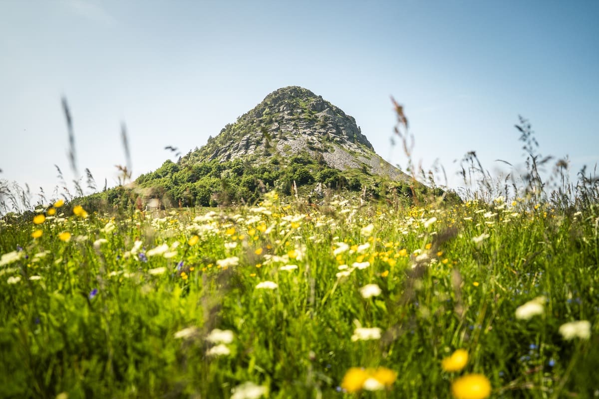 Vous empruntez un petit sentier qui traverse les pâturages avant de rejoindre le plateau des Coux. Au pied de la montagne, les ânes font une pause pendant que vous partez à la découverte du sommet.