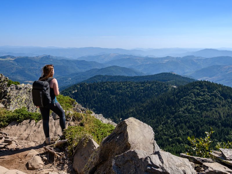 Vous suivez un sentier qui traverse une belle forêt de conifères avant de rejoindre le sommet du Suc de la Lauzière, au cœur de la zone des cinq sucs, un ensemble d’anciens volcans classés Espaces Naturels Sensibles en Ardèche.