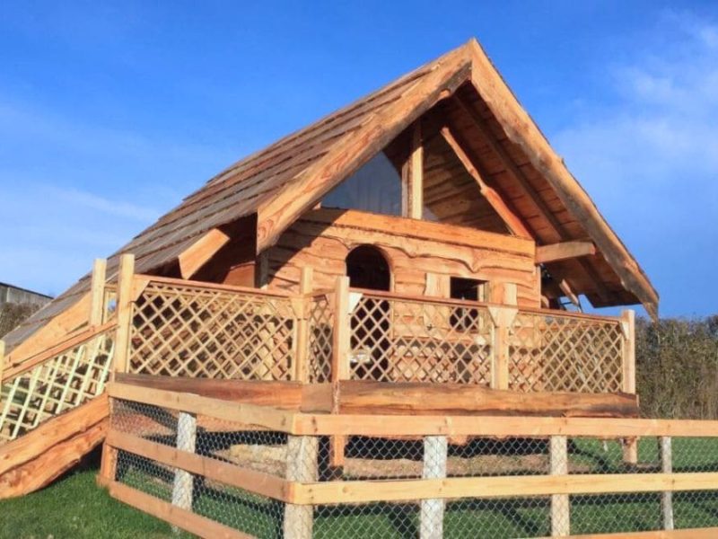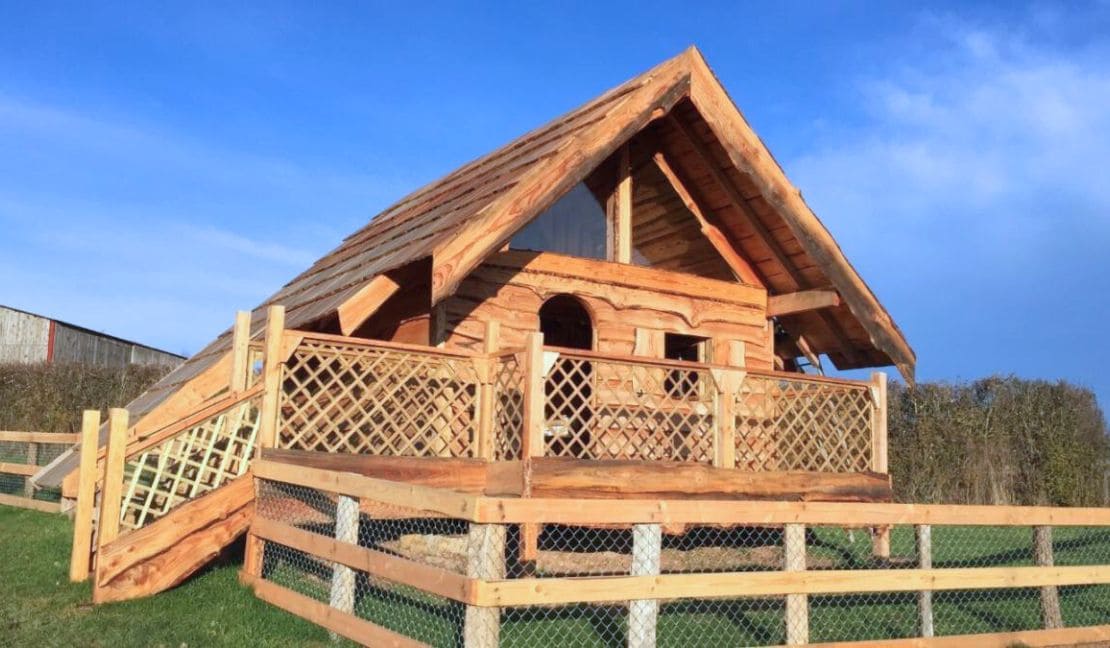 Hébergement en cabane trappeur au milieu d'une mini ferme (cochons nains, âne nain, poneys, volailles et chèvres naines) (douches et toilettes privées dans bloc sanitaire commun) et repas servis dans votre hébergement.